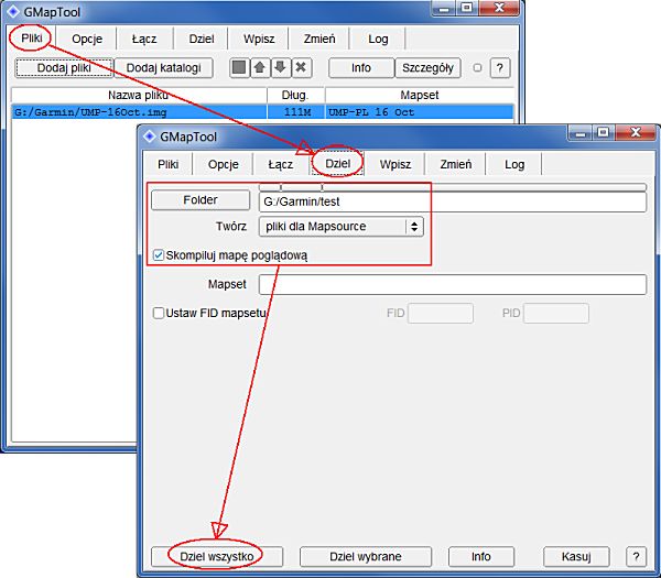 Jeżeli wybrane pliki img nie są mapsetem utoworznym przez Mapsource lub próbujesz połączyć kilka różnych mapsetów, należy wypełnić również nazwę mapsetu w polu "Mapset" i nadać numer FID i PID.
